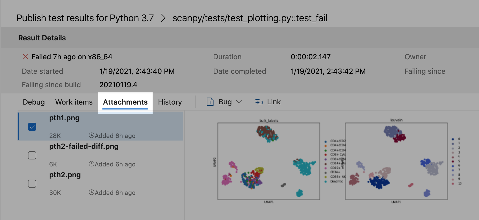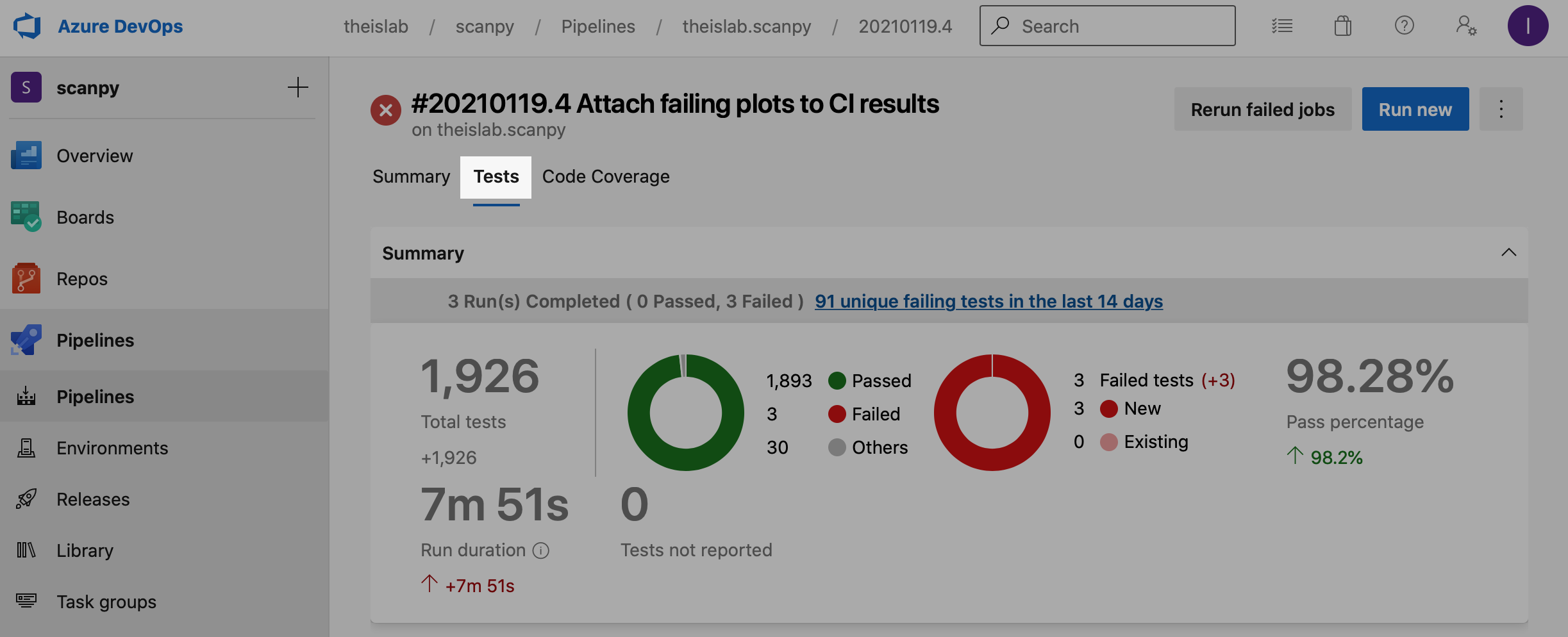 The fixtures check_same_image and image_comparer upload plots from failing tests so you can view them from the azure pipelines test viewer. To find these, navigate to the tests tab for your build