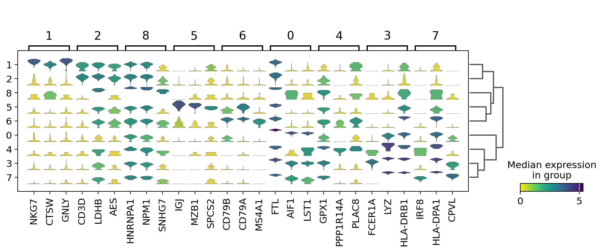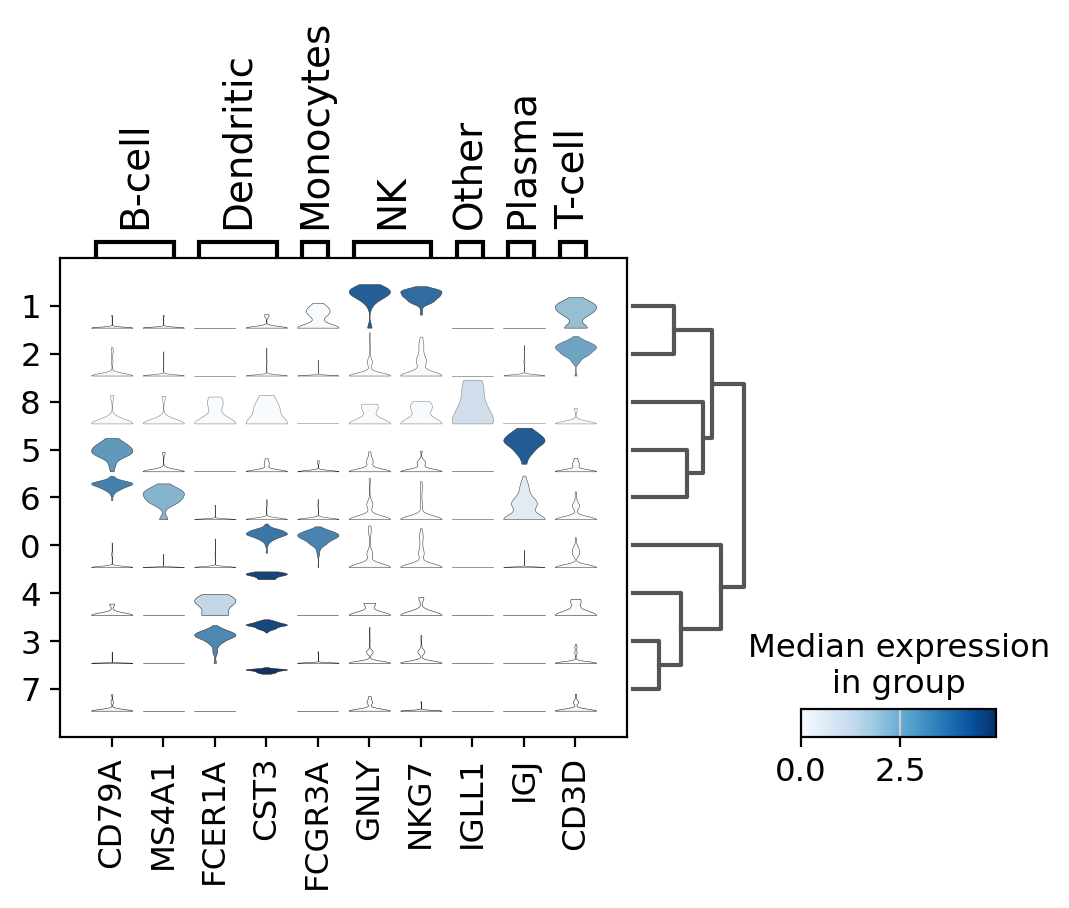 To simultaneously look at the violin plots for all marker genes we use sc.pl.stacked_violin. As previously, a dendrogram was added to group similar clusters