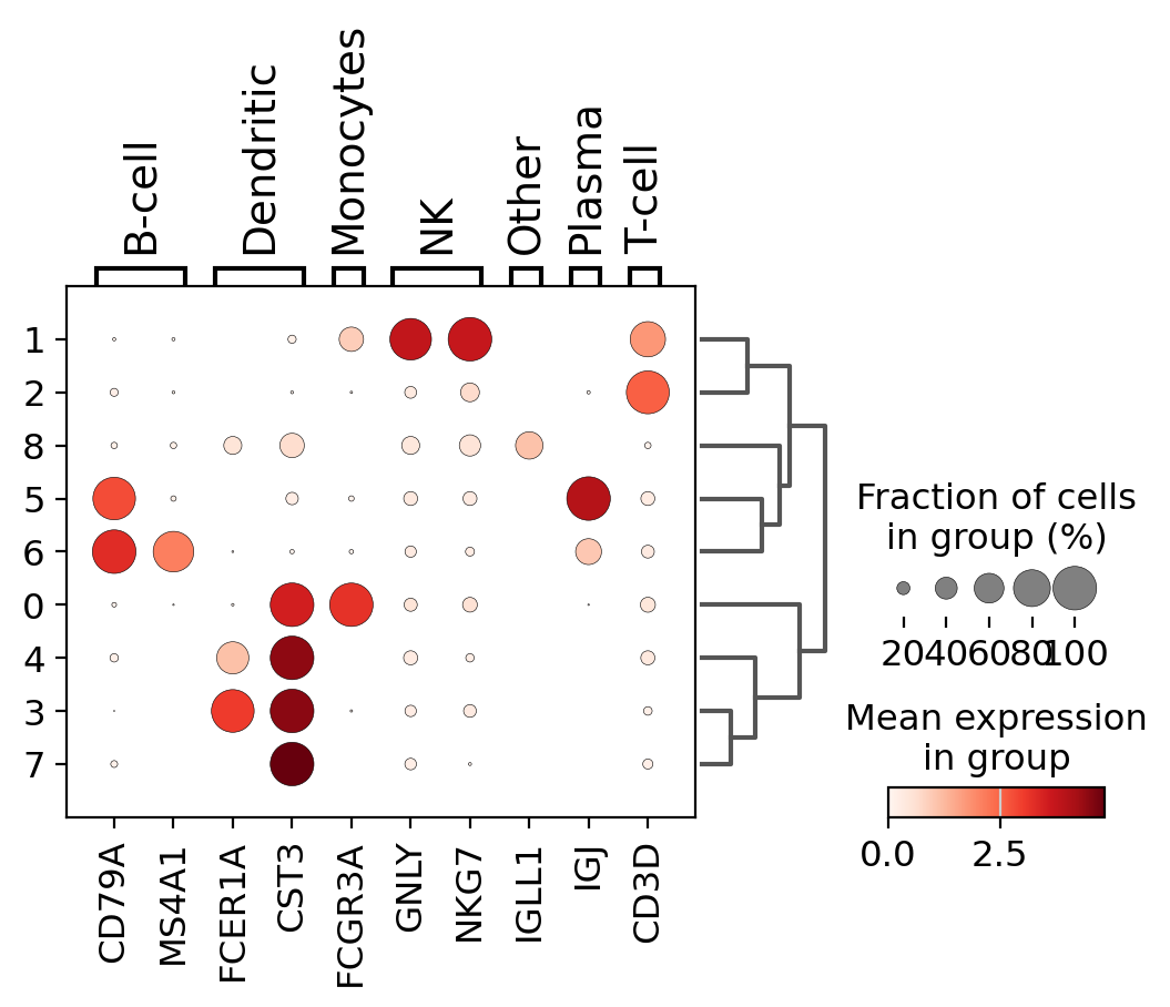 A quick way to check the expression of these genes per cluster is to using a dotplot. This type of plot summarizes two types of information: the color represents the mean expression within each of the categories (in this case in each cluster) and the dot size indicates the fraction of cells in the categories expressing a gene.