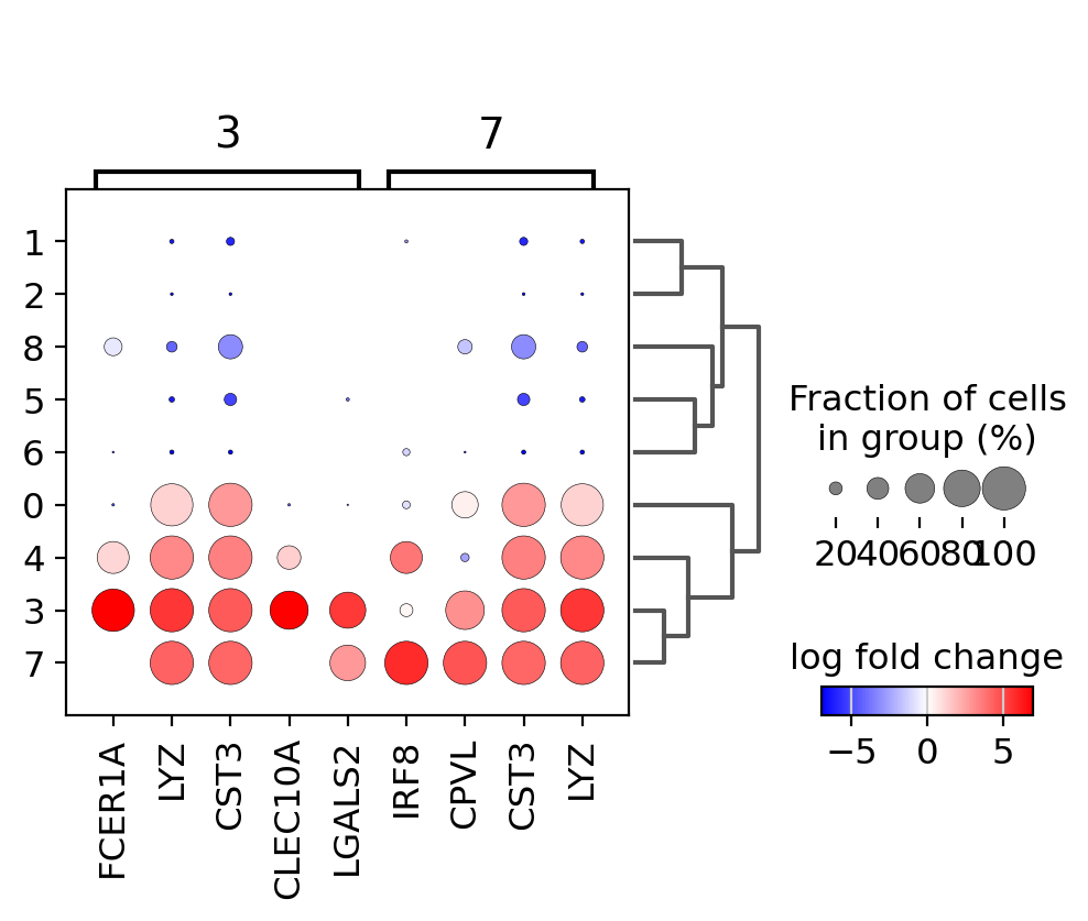 Also, it is also useful to add a dendrogram to the graph to bring together similar clusters. The hierarchical clustering is computed automatically using the correlation of the PCA components between the clusters.