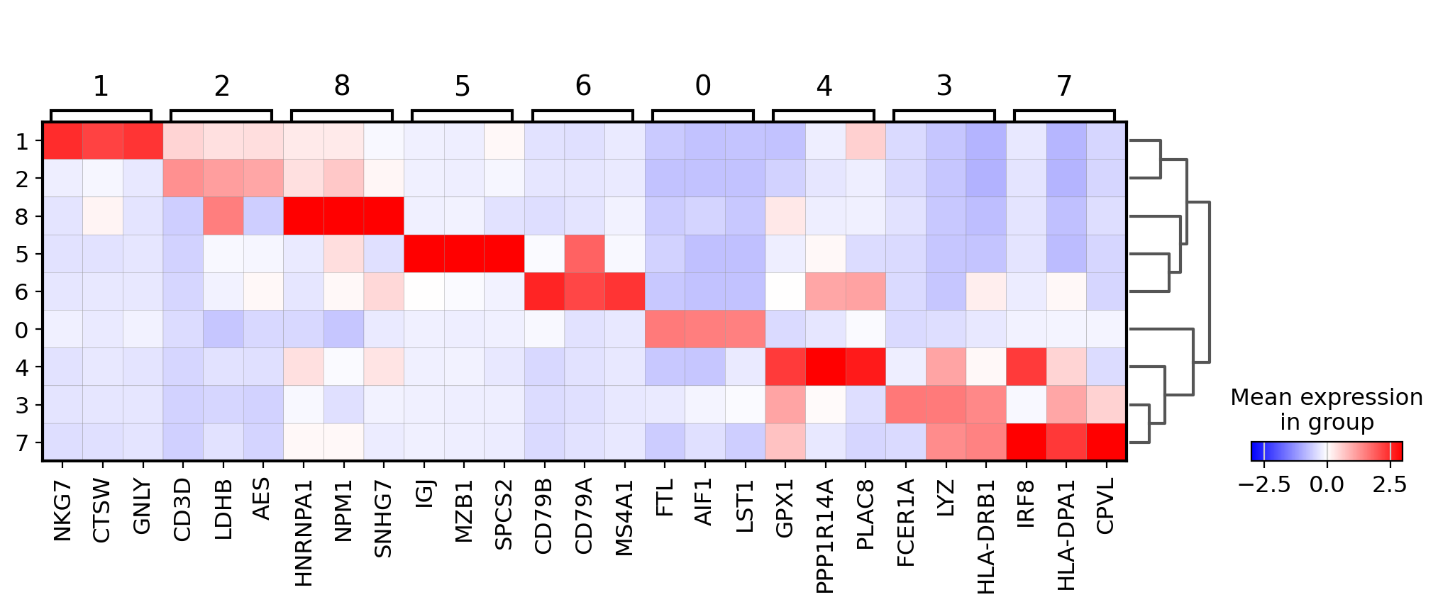 A simple way to visualize the expression of genes is with a matrix plot. This is a heatmap of the mean expression values per gene grouped by categories. This type plot basically shows the same information as the color in the dotplots.